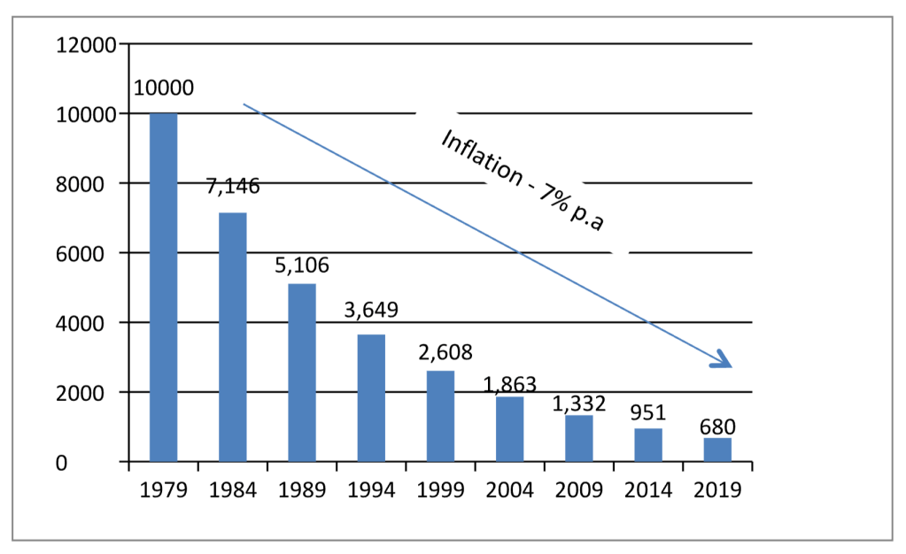 the devaluation of Money. - The average inflation per year for last 40 years is around 7%. It means the value of Rs. 10,000/- in 1980 is worth Rs. 680/- now as indicated below.